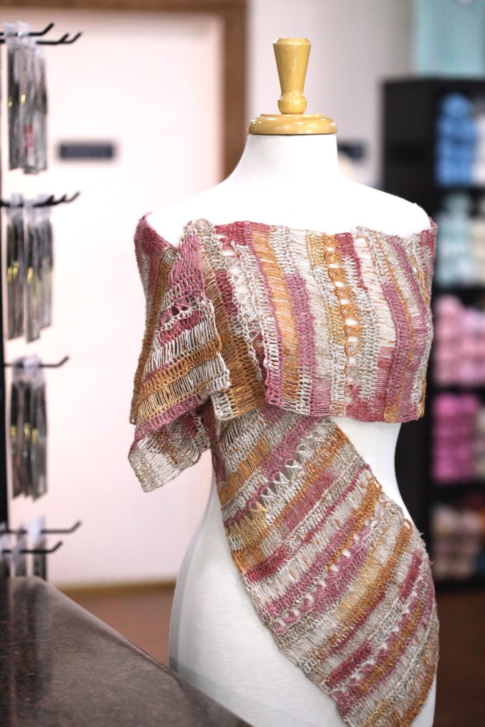 A beachy scarf that features a modern update to traditional broomstick lace. The linen blend makes it a lightweight and comfortable accessory for summer weather!